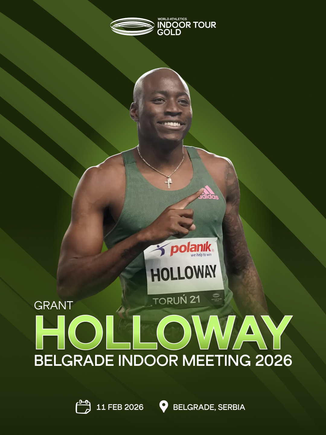 Holloway introduced himself to Belgrade and the world in the best possible way in 2022, when he claimed the world indoor title in the 60 meters hurdles. He is the world indoor record holder with a time of 7.29 seconds, set in Madrid on February 24, 2021—a time he matched in Belgrade on March 20, 2022. He successfully defended his world indoor gold in this discipline in 2024 in Nanjing, China.